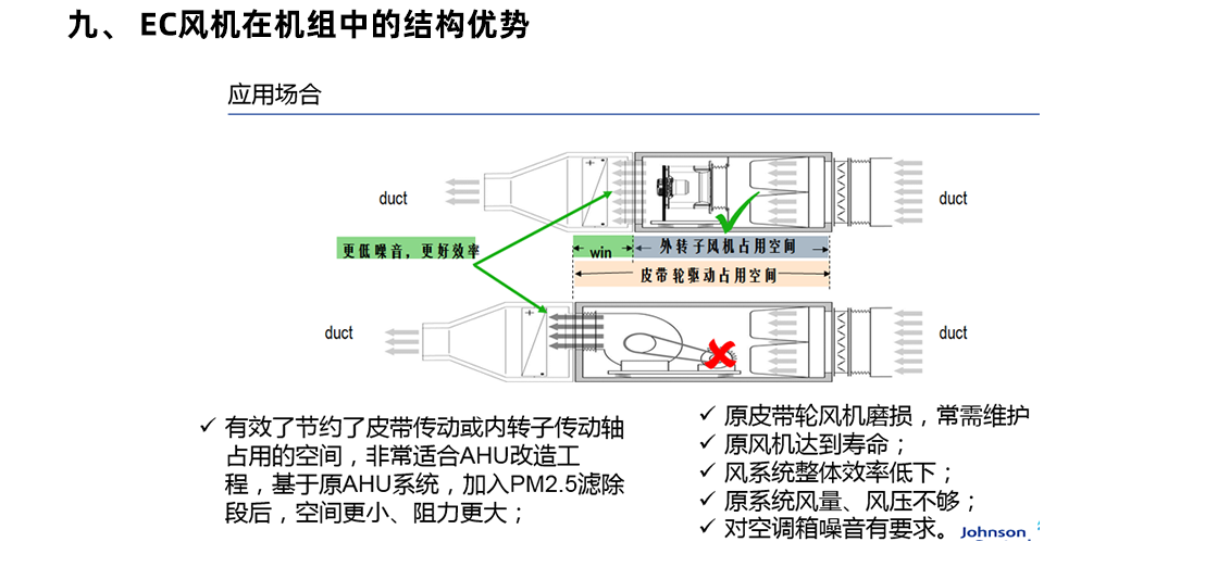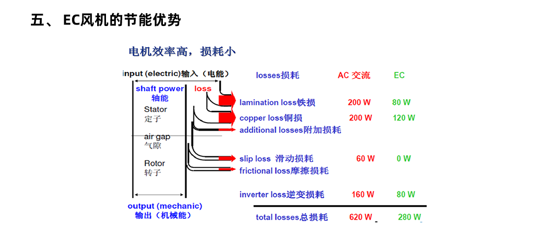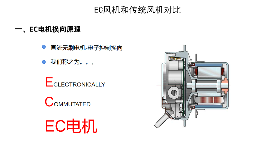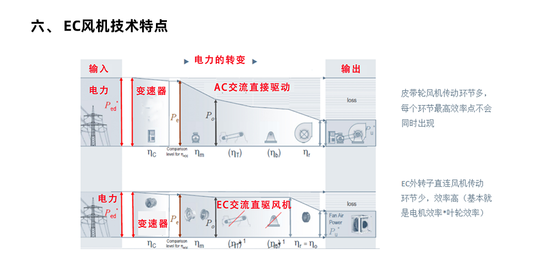 我司目前的 MAU/AHU 機(jī)柜風(fēng)機(jī)所采用的是傳統(tǒng)的皮帶傳動(dòng)式風(fēng)機(jī),即通過皮帶和皮帶輪驅(qū)動(dòng)的風(fēng)機(jī),內(nèi)部電機(jī)為三相異步電機(jī)。三相異步電機(jī)本身效率低,并且調(diào)速困難,再加上皮帶傳動(dòng)的機(jī)械損耗,使得機(jī)柜整體效率更低,且能耗大。為響應(yīng)國(guó)家節(jié)能減排的號(hào)召,降低企業(yè)生產(chǎn)成本,提高企業(yè)市場(chǎng)競(jìng)爭(zhēng)力,現(xiàn)計(jì)劃將皮帶傳動(dòng)式風(fēng)機(jī)更換為高效 EC 風(fēng)機(jī),以達(dá)到節(jié)能降耗的目的。