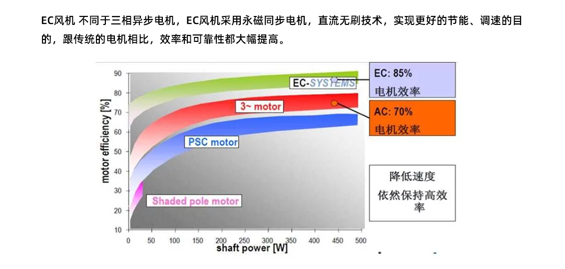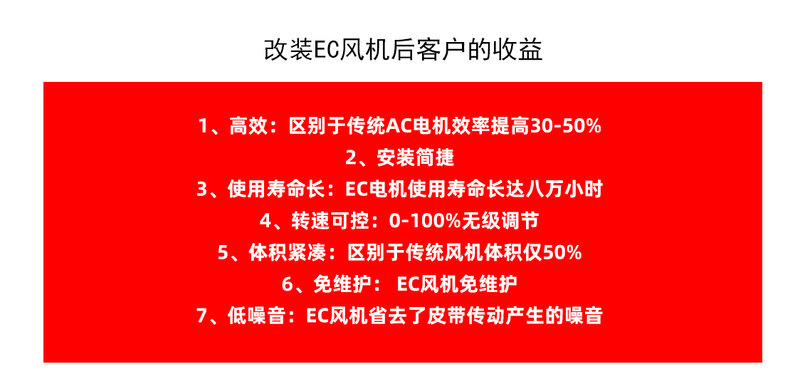 延長(zhǎng)設(shè)備壽命:EC風(fēng)機(jī)具有更高的能效和更低的磨損率,能夠延長(zhǎng)設(shè)備的使用壽命,降低設(shè)備的維護(hù)成本。