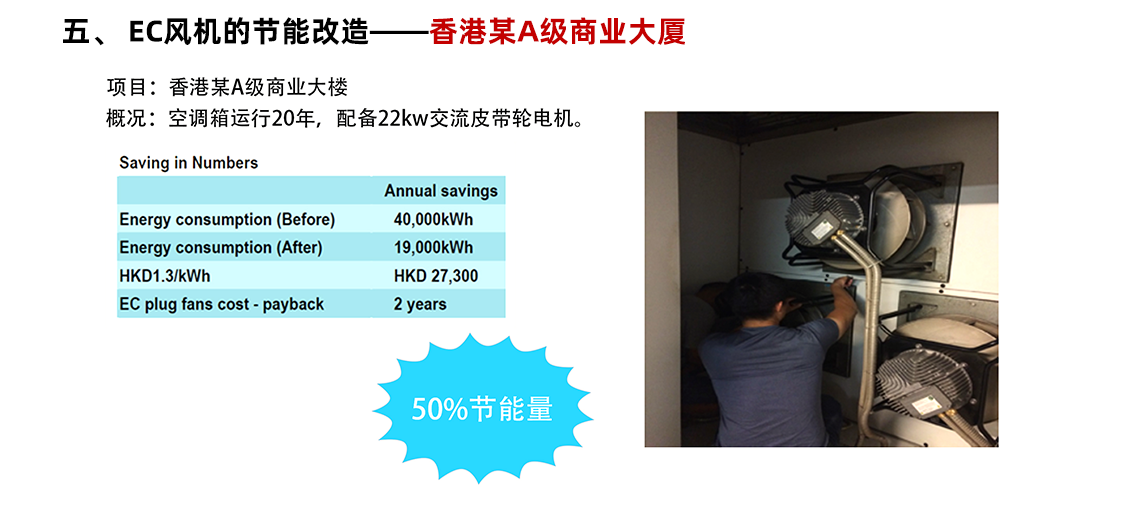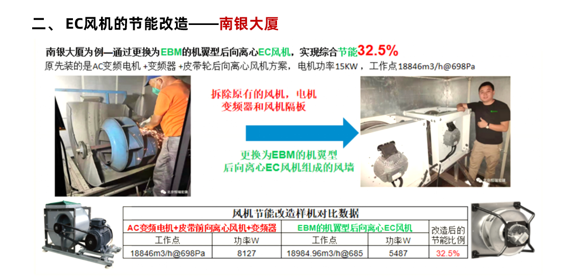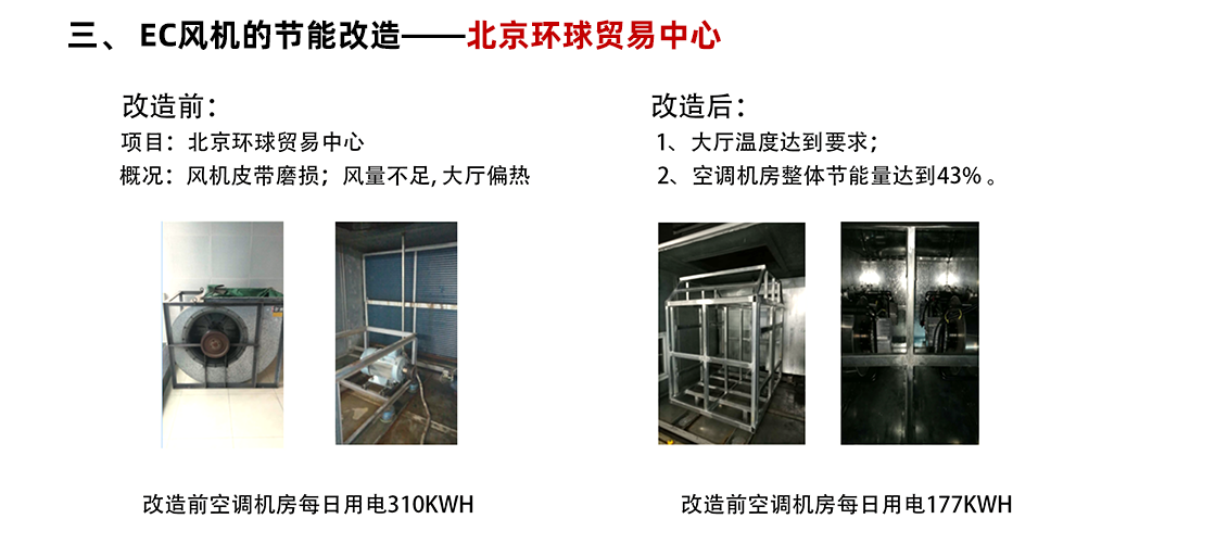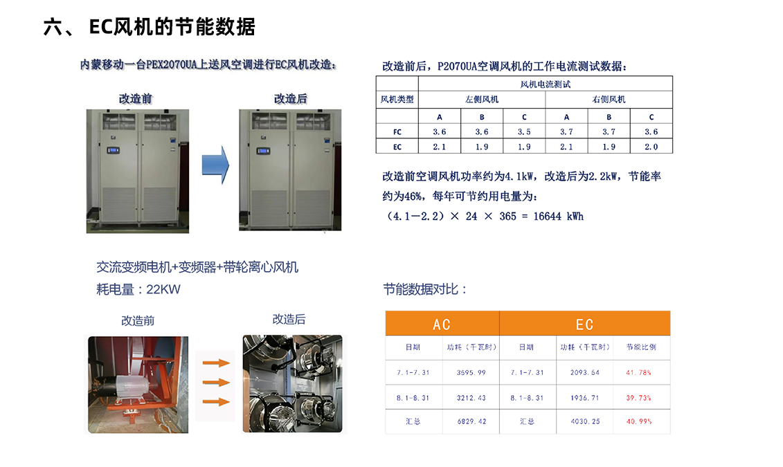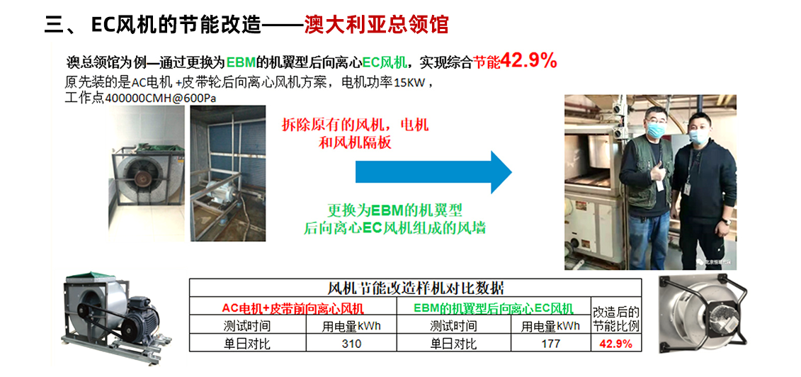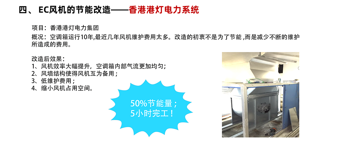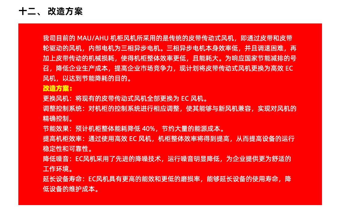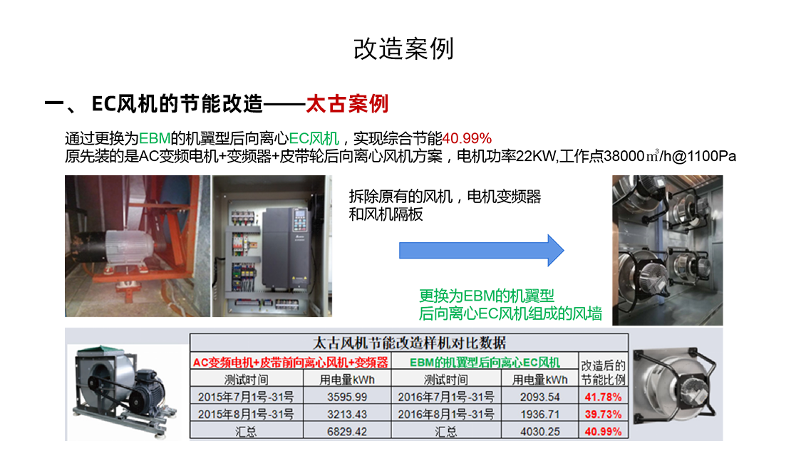 更換風(fēng)機(jī):將現(xiàn)有的皮帶傳動(dòng)式風(fēng)機(jī)全部更換為 EC 風(fēng)機(jī)。